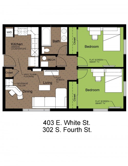 These completely upgraded two bedroom apartments feature granite countertops, plank flooring, and Smart TVs in each bedroom. They are conveniently located just blocks from County Market and near the University of Illinois Engineering Quad. They also include an open living and dining area, an in-unit washer/dryer, a walk-in shower, and wall mounted bookshelves in each bedroom.
