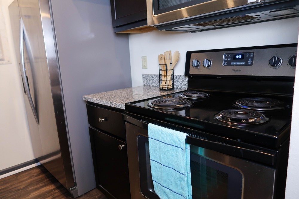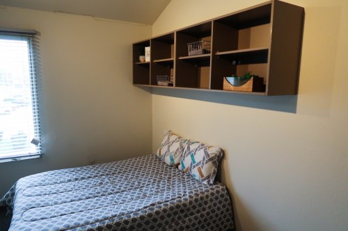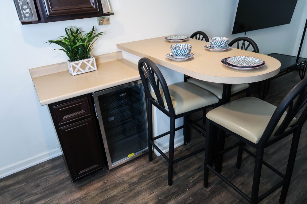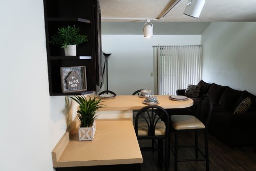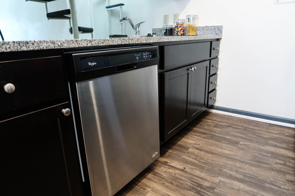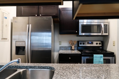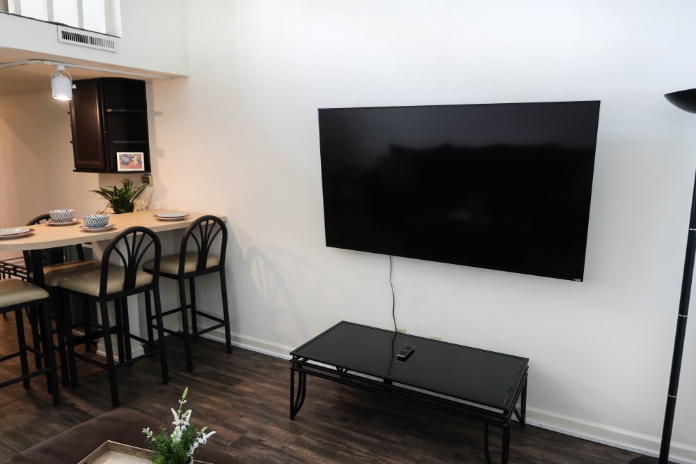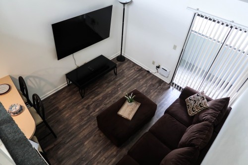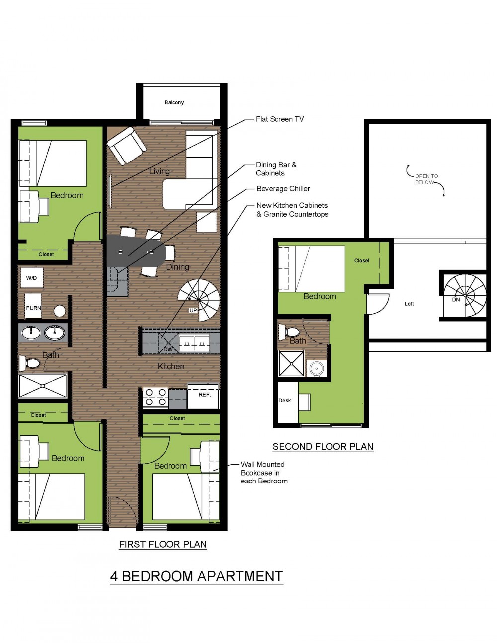 These completely upgraded four bedroom/two bathroom apartments feature granite countertops, plank flooring, stainless steel appliances, and a 70" Smart TV. They include an in-unit washer/dryer, dishwasher, wall-mounted bookshelves, and a beverage chiller. They are located in a quiet neighborhood just blocks from County Market.